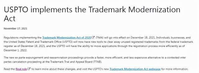 美國專利商標局在美國時間2021年11月17日發(fā)布了一則關于商標現代化法案2020的最新修訂,并定于美國時間2021年12月18日正式實施。該修訂主要對在實施日期后不實際使用的美國商標的權力穩(wěn)定性產生影響,加速了新申請注冊商標的審核速度。
