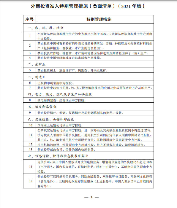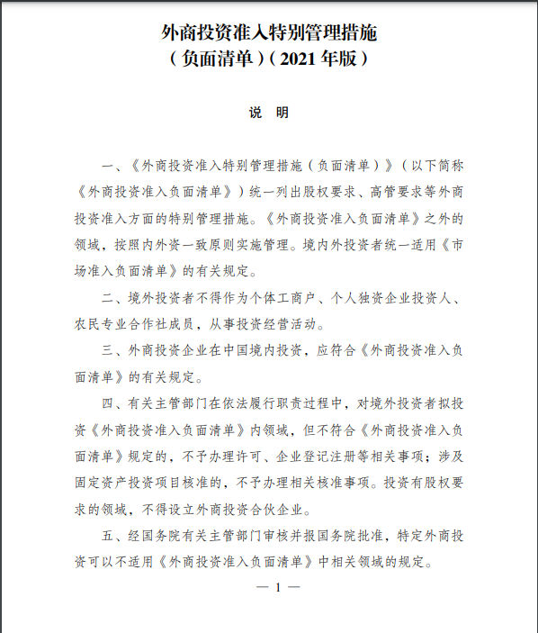 12月27日,國家發(fā)展改革委、商務(wù)部發(fā)布了《外商投資準入特別管理措施(負面清單)(2021年版)》和《自由貿(mào)易試驗區(qū)外商投資準入特別管理措施(負面清單)(2021年版)》。