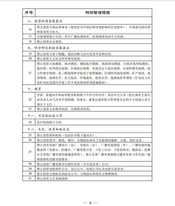 第三,提高外資準入負面清單精準度。在負面清單說明部分增加“從事外資準入負面清單禁止投資領(lǐng)域業(yè)務(wù)的境內(nèi)企業(yè)到境外發(fā)行股份并上市交易的,應(yīng)當(dāng)經(jīng)國家有關(guān)主管部門審核同意,境外投資者不得參與企業(yè)經(jīng)營管理,其持股比例參照境外投資者境內(nèi)證券投資管理有關(guān)規(guī)定執(zhí)行”,由證監(jiān)會和有關(guān)主管部門按規(guī)定對從事負面清單禁止領(lǐng)域業(yè)務(wù)的境內(nèi)企業(yè)到境外上市融資實行精準化管理。