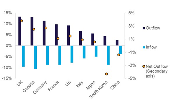 事實(shí)上,在全球人才競(jìng)賽中,英國(guó)要正在跑輸其他國(guó)家,出現(xiàn)非常不利的人才外流情況。 如下圖所見(jiàn),在1996-2015期間,每年離開(kāi)英國(guó)的發(fā)明家比抵達(dá)的多,相反只有韓國(guó)和中國(guó)在同一時(shí)期出現(xiàn)人才凈流入。如果允許人才外流繼續(xù)發(fā)生下去,從長(zhǎng)遠(yuǎn)來(lái)看,英國(guó)作為創(chuàng)新強(qiáng)國(guó)的競(jìng)爭(zhēng)力最終將下降,未來(lái)增長(zhǎng)將收到影響而放緩。