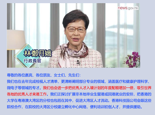 在第20屆中國國際人才交流大會上,前行政長官林鄭月娥表示,本屆政府銳意配合國家十四五規(guī)劃,把香港建設成為國際創(chuàng)新科技中心。在吸引人才上,優(yōu)秀人才入境計劃年度配額將倍增,當局并正探討擴展非本地畢業(yè)生留港或回港就業(yè)的安排。