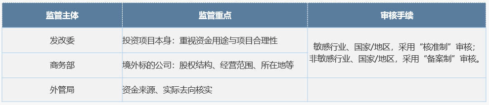 根據(jù)相關(guān)法規(guī)要求,境內(nèi)非國(guó)有企業(yè)進(jìn)行境外直接投資,投資項(xiàng)目需要獲得商務(wù)部門(mén)的核準(zhǔn)或備案、發(fā)改委的核準(zhǔn)或備案、外管局登記備案才能進(jìn)行境內(nèi)資金的合規(guī)出境;國(guó)有企業(yè)需額外向國(guó)資委遞交審批報(bào)備。