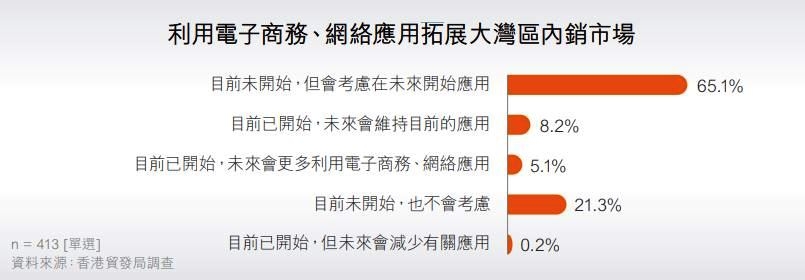 電子商務及網絡應用近年急速發(fā)展,通過互聯網的各種電子交易盛行,包括供應鏈管理有關的電子數據交換應用,以及網絡行銷和網購活動等大行其道。雖然如此,受訪企業(yè)當中,只有不到14%受訪企業(yè)表示目前已開始利用電子商務、網絡應用拓展大灣區(qū)的內銷市場,包括8.2%未來會維持目前的應用,及5.1%未來會更多利用電子商務、網絡應用。雖然如此,大部分受訪企業(yè)表示會考慮在未來開始應用(65.1%),只有21.3%表示目前未開始、也不會考慮有關應用。