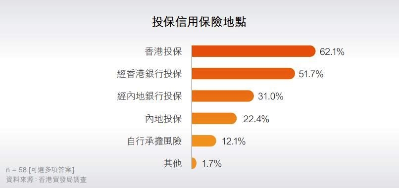 在有投保信用保險的企業(yè)當中,不少企業(yè)通過兩個或以上地點投保。當中,大部分企業(yè)通過香港直接投保(62.1%),51.7%則經香港銀行投保,也有31.0%經內地銀行投保、22.4%直接在內地投保等,也有少數表示會到海外投保(其他:1.7%)。