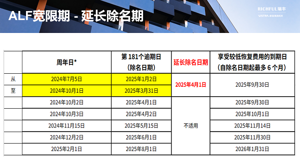 *如果周年日期是周末或公共假期,F(xiàn)SA將在隨后的下一個工作日接受 ALF 申請,不會受到任何處罰,但這不會改變除名日期的計算或較低的恢復(fù)費(fèi)用期限。