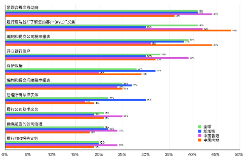 圖表顯示了企業(yè)在其他國家或地區(qū)設(shè)立和管理法律實體時面臨的重大挑戰(zhàn)(受訪者排名前三位)