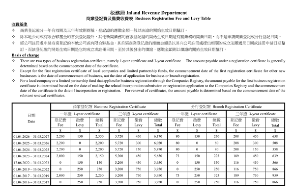 根據(jù)稅務(wù)局公布的收費(fèi)表,在 2026年4月1日至2027年3月31日 期間開始生效的商業(yè)登記證,應(yīng)繳費(fèi)用如下: